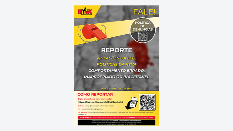Para denunciar violaçõeas da Lei e das Políticas da Hyva, irregularidades, comportamentos inadequados ou inaceitáveis, utilize este formulário ou envie-nos um e-mail para whistleblow@hyva.com